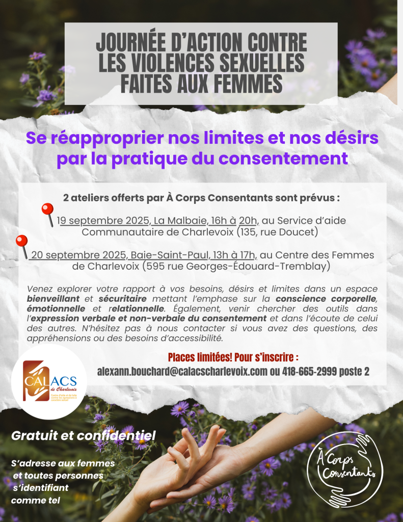 Deux ateliers sont offerts aux femmes ou à toute personne s’identifiant comme tel, de la région de Charlevoix, les 19 et 20 septembre 2025, dans le cadre de la Journée d’action contre la violence sexuelle faite aux femmes.